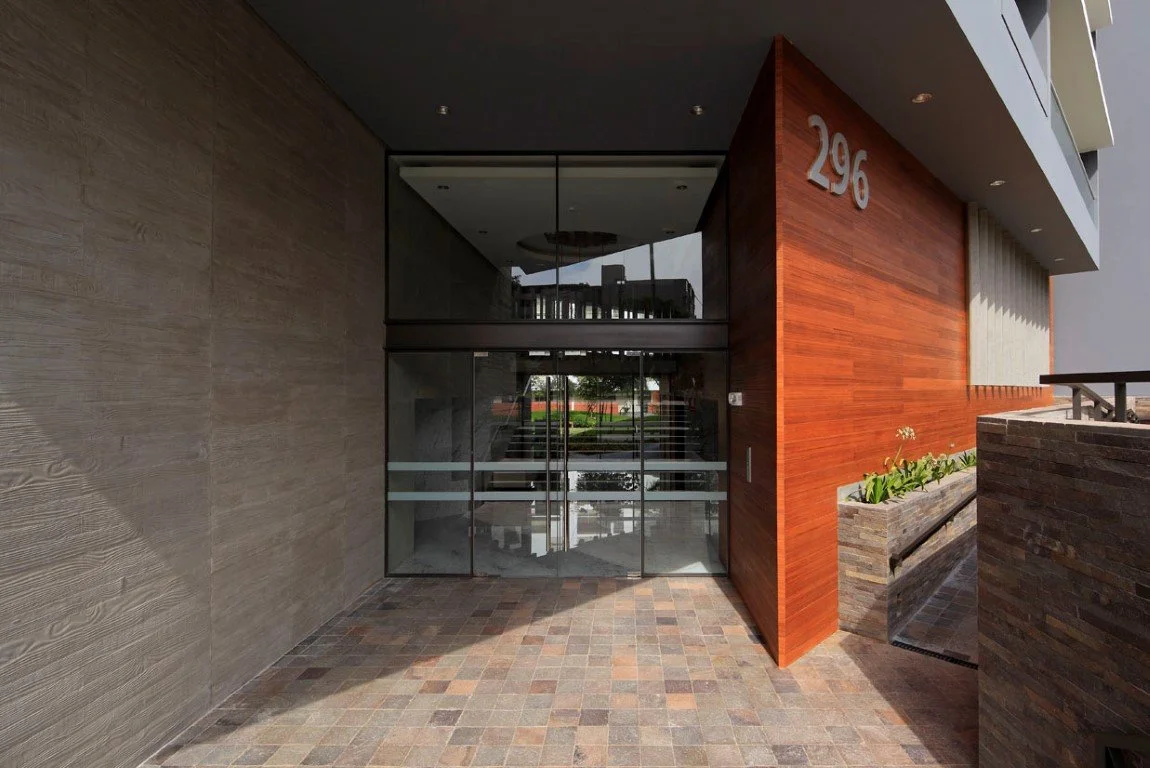 El primer piso y las áreas comunes incorporaron sistemas modulares, destacando el ingreso principal, gimnasio y sauna, donde se emplearon accesorios de acero inoxidable y revestimientos espejados, integrados como parte del diseño interior.