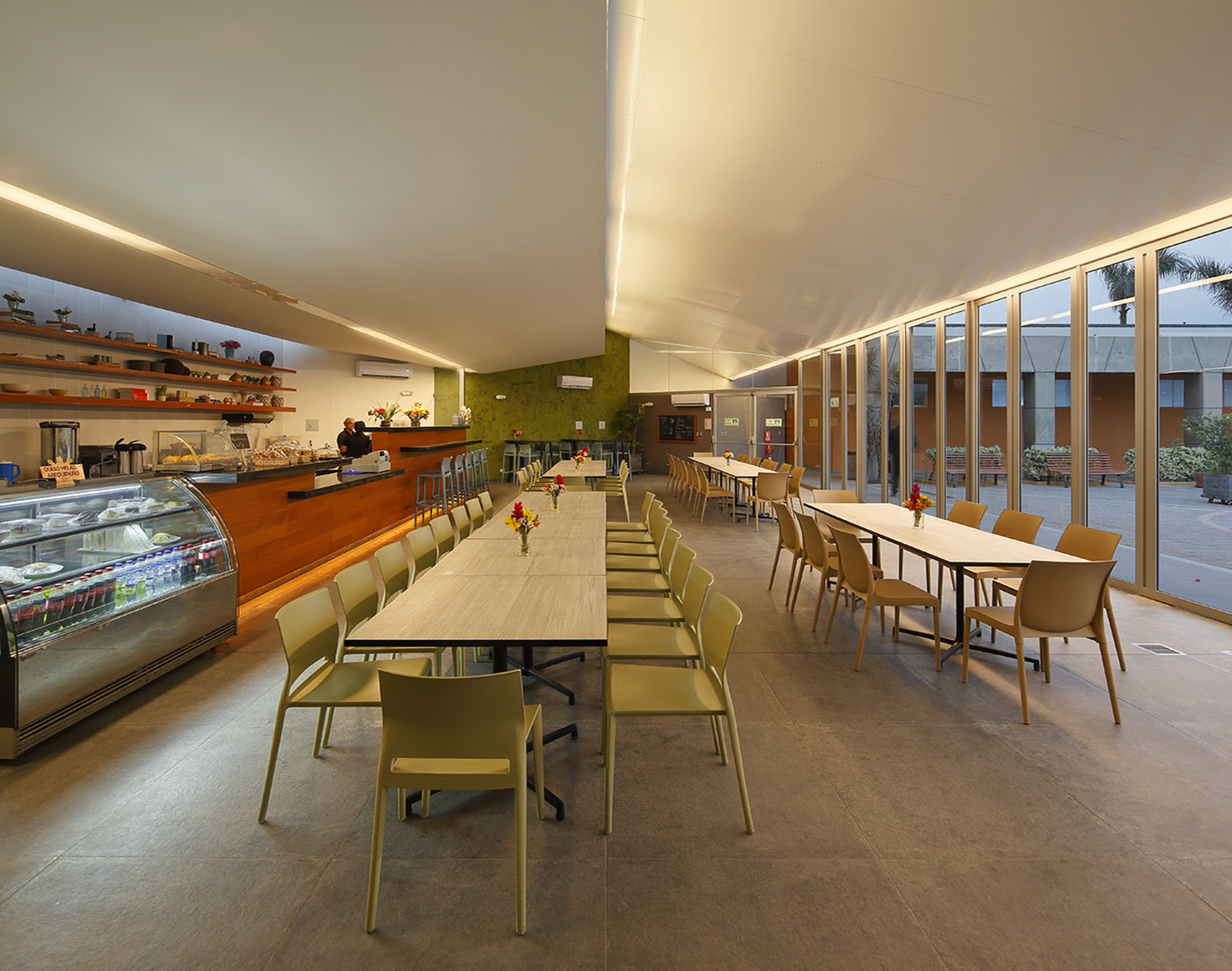 El proyecto se complementó con un falso cielo raso de aluminio compuesto (PAC) en acabado blanco, desarrollado como un sistema continuo sin juntas visibles. La solución permitió resolver la geometría a dos aguas del espacio y cumplir con requerimientos de higiene, mantenimiento y durabilidad, propios de un ambiente de comedor, reforzando la sensación de continuidad y limpieza visual.